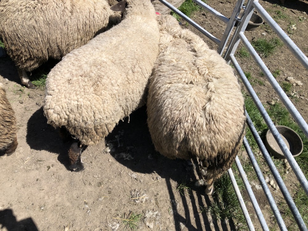 The ewe on the right is exhibiting wool break, which is when the wool is weak from stress-related factors. Checking the coat is part of checking the overall health of the animal. Click to enlarge.