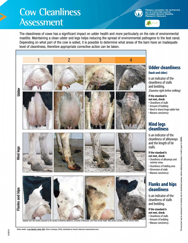 Factors that can affect cleanliness are the comfort and cleanliness of the stall, amount and type of bedding, manure consistency, cleanliness of alleys, space allowance per cow, and amount of hair on the udder. The Facility Characteristics and Cow Comfort on U.S. Dairy Operations Report in 2007 by National Animal Health Monitoring System (NAHMS) reported that "the lowest percentage of cows with a hygiene score of 3 were on operations that bedded stalls with coarse sand, composted manure, or dried manure (primarily freestall operations)" whereas cows that were bedded with straw, sawdust, or fine sand typically had dirtier cows. The NAHMS report also found that as bedding quantity and stall condition decreased the percentage of dirty cows increased. These findings emphasize that both bedding type and bedding management frequency play a direct role in overall cow cleanliness.