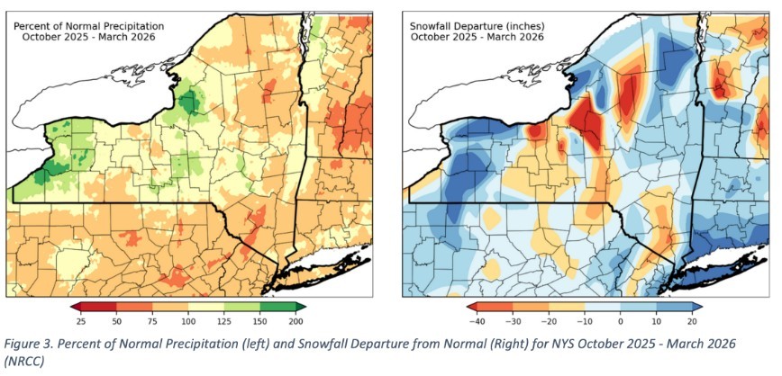 Despite fall and winter weather that was more normal for New York than some recent years, a late 2025 crop harvest and a wet March have some producers feeling tight on manure storage capacity. (See the maps below from the Northeast Region Climate Center (NRCC) showing departures from normal for both total precipitation and snowfall from October 2025 - March 2026 in Figure 3). While there is no requirement for minimum days of storage, PRO-DAIRY specialists advise that having at least six-months of storage capacity between farm-located and satellite storages is a risk management strategy that allows for sound (and CAFO compliant) manure application decision-making. Anytime you add cows, don't properly agitate and/or remove settled solids, add bunker silo storage and runoff, change parlor water usage or make other changes on the farm - you are impacting manure storage capacity. So, if you are feeling pinched this year, it could be a good time to re-evaluate storage volumes and management with your planner.