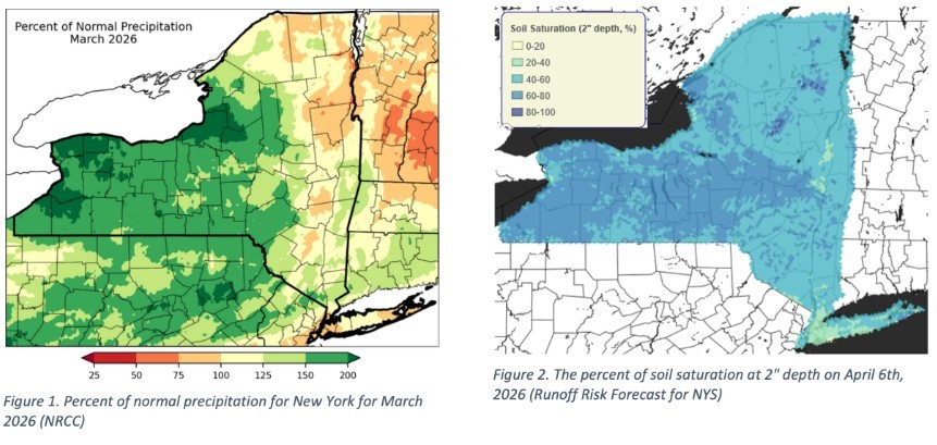 March 2026 has been wet, hovering around 150 percent of normal precipitation for much of New York (Figure 1). While this has some manure storages approaching or exceeding their full operational capacity, it is critical to follow the prohibited spreading conditions in the CAFO permit, the Revised Winter And Wet Weather Manure Spreading Guidance and the spreading plans in your CNMP as it may have also created saturated soil conditions across much of the state (Figure 2). Care should be taken when deciding if, when and where to make manure applications. You can monitor forecasts to identify days in the near term that may have conditions with lower risk using the Runoff Risk Forecast for New York State. Monitoring fields and tile outlets for runoff during and after applications is also advised.