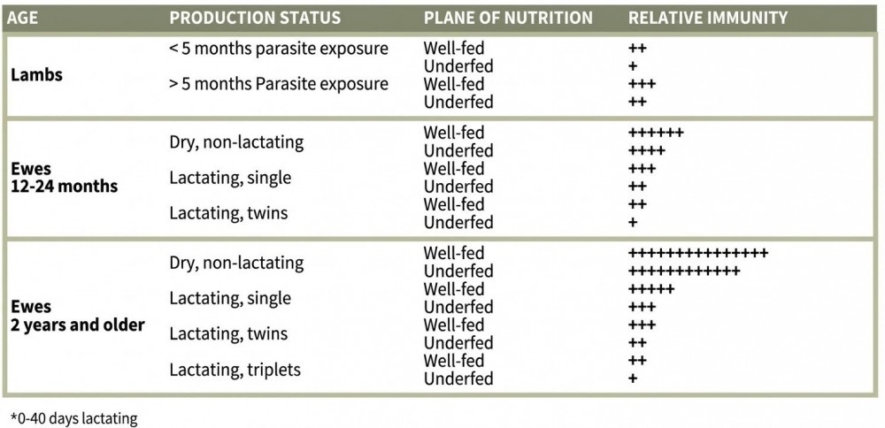 Figure 1. This chart shows the interplay between age, stage of production, plane of nutrition, and relative immunity for lambs and ewes. Chart from Ehrhardt, 2024. Click to enlarge.